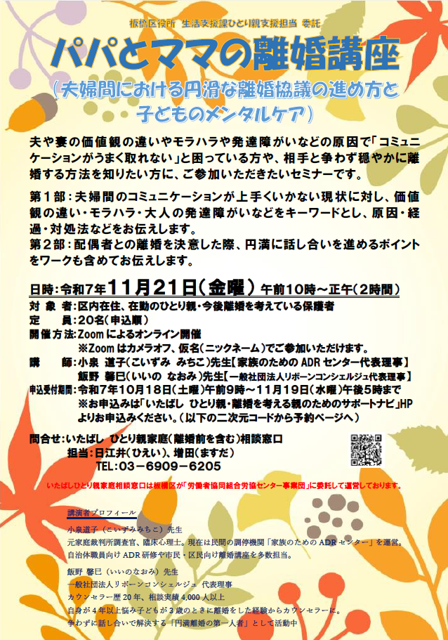◆申込先:「いたばし ひとり親・離婚を考える親のためのサポートナビ」よりお申込みいただけます。